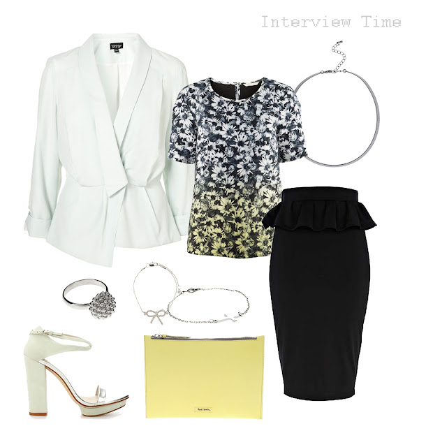 blazer . Topshop, floral blouse . H&M, peplum skirt . River Island, sandals . Zara, yellow clutch . Paul Smith,